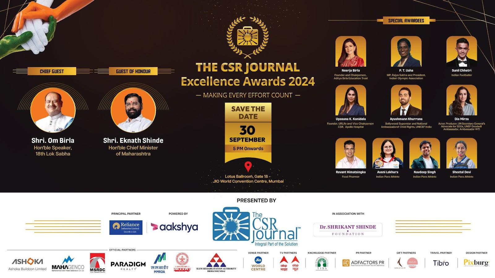 Mumbai, September 2024: The 7th edition of The CSR Journal Excellence Awards is all set to be held on the 30th of September 2024, at the Lotus Ballroom, Gate – 18, Jio World Convention Centre in Mumbai. The Honourable Speaker, 18th Lok Sabha Shri Om Birla and the Honourable Chief Minister of Maharashtra Shri Eknath Shinde will be gracing the event as our Chief Guests for this year.