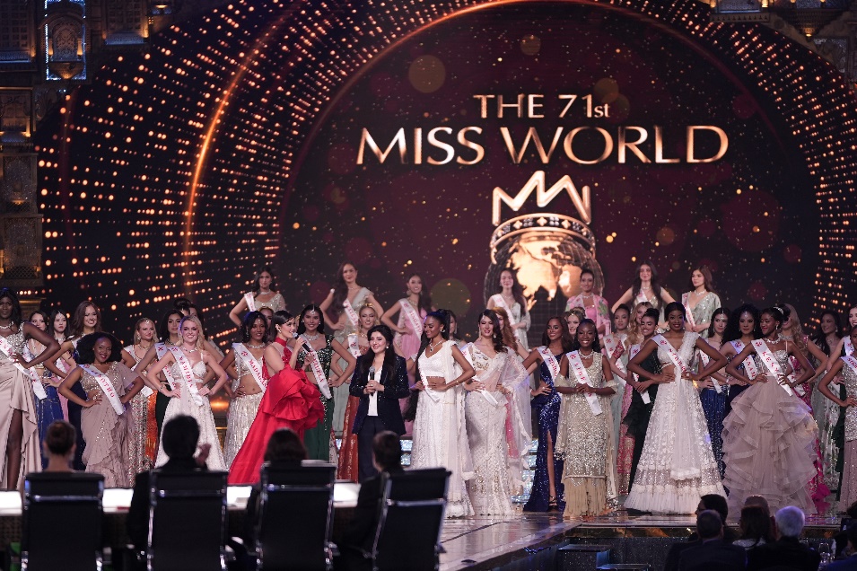 The Miss World contestants from Asia-Oceania were dressed in a floral printed collection which is made by Ahimsa Silk, a non-violence silk made without killing the silk worm. The prints pay tribute to the indigenous flora and fauna of India while integrating geometric symbols from age old Indian Architecture.
