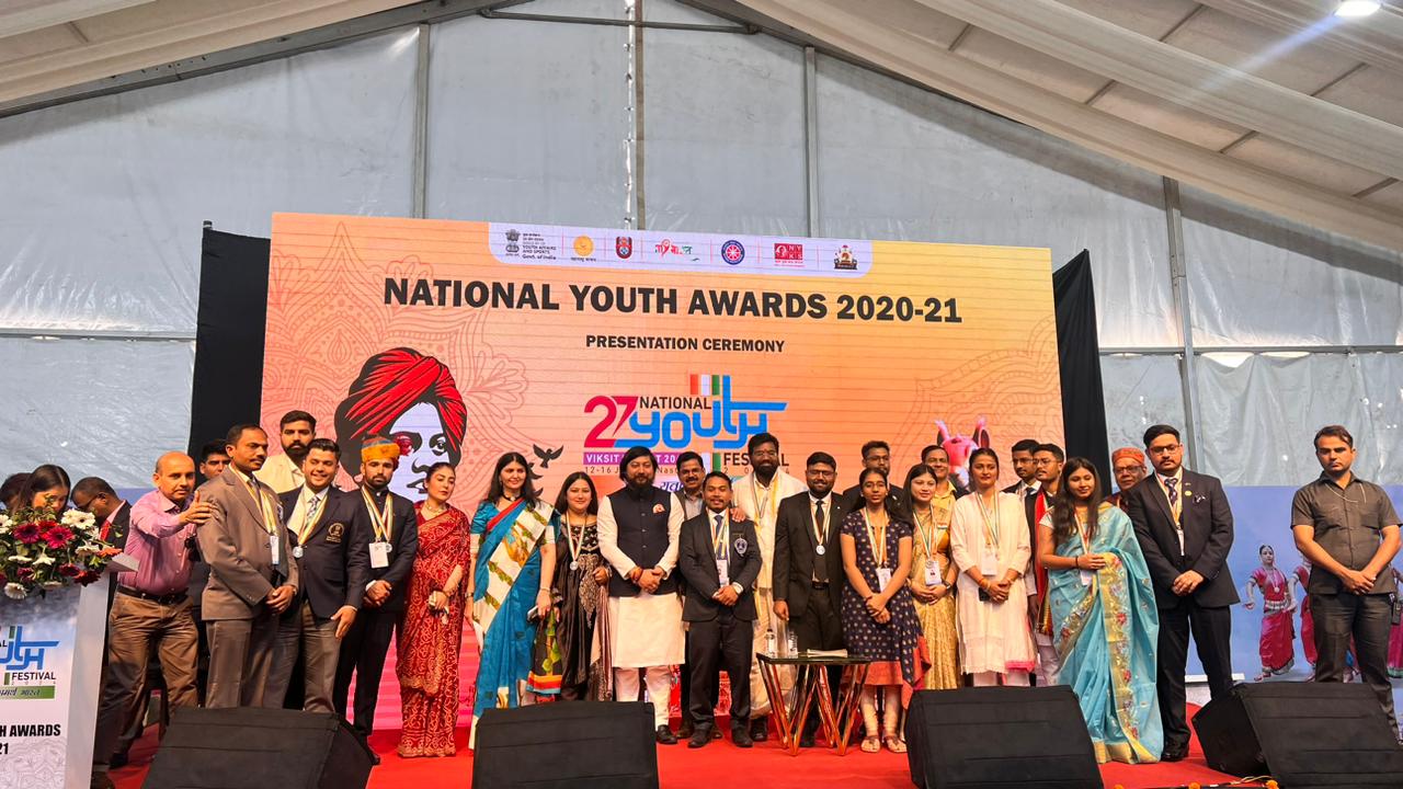 The 27th National Youth Award was successfully held in Nashik from 12-16 January, 2024, during the 4th day of the National Festival. Fifteen youth from across the country were honored with the National Youth Award 2021 during this event, presented by the esteemed Hon.Minister of State for Youth Affairs and Sports, Mr. Nisith Pramanik. The ceremony was attended by Hon. Ms. Vanita Sood, Director of the Ministry of Youth Affairs, Hon. Mr. Radhakrishna Game, Commissioner of the respective department, and Hon. Dr. Suhas Diwase, the respected Sports Commissioner of Maharashtra.