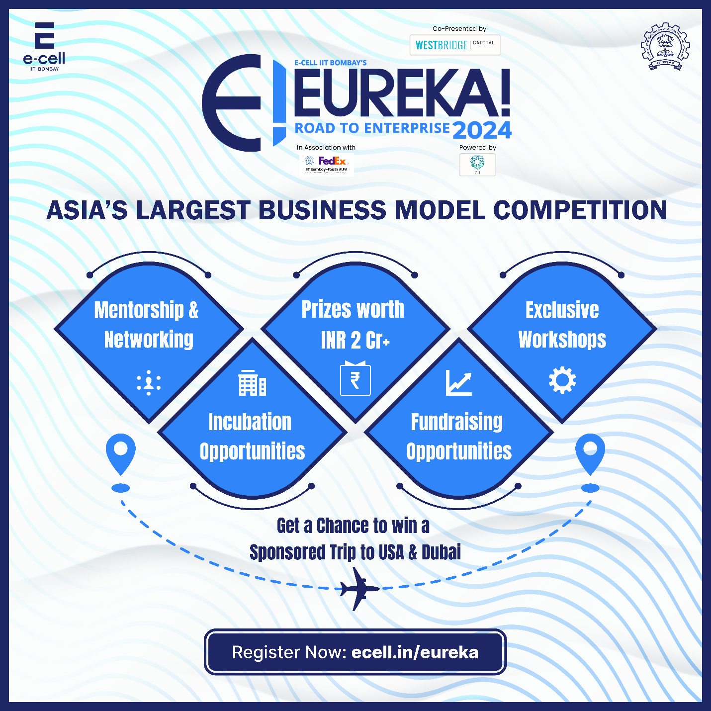 Eureka! 2024 promises to be grander than ever, with incentives worth INR 2 crore, 50+ venture capitalists, 300+ mentors, and opportunities to win sponsored visits to USA and Dubai to pitch in global entrepreneurship-based competitions. Eureka! is co-presented by WestBridge Capital in association with FedEx, powered by Gulf Islamic Investments (GII), with Ovington Capital Partners as the Venture Studio Partner. It is supported by The Nudge Institute as Social Partner, Enrission India Capital as Gold Sponsor, Venture Catalysts as Venture Capital Partner, and NRL as Energy Innovation Partner.