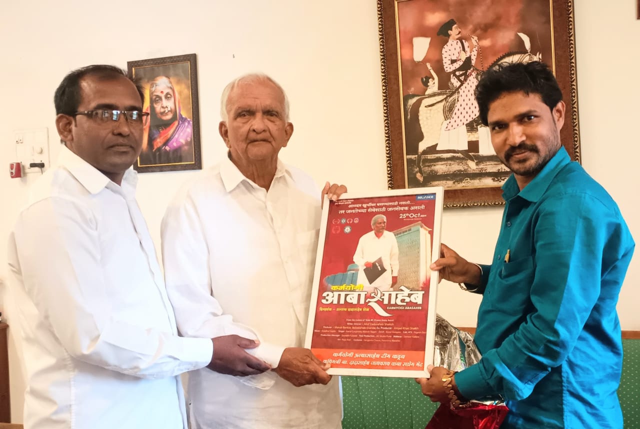 Pune, Correspondent: Son of Solapur district and writer, director Altaf Dadasaheb Shaikh. The poster of the film “Karmayogi Aaba Saheb”, based on the life of former Maharashtra cabinet minister V. Aaba Saheb and Ganpatrao Deshmukh, was inaugurated by Aaba Saheb’s then cabinet colleague and former agriculture minister Dadasaheb Jadhavrao. On this occasion, former agriculture minister Dadasaheb Jadhavrao was presented a poster frame of the film “Karmayogi Aaba Saheb” as a gift by the director, writer Altaf Dadasaheb Sheikh and Satyashodhak multipurpose social institution founder/president Vishal Bhende.