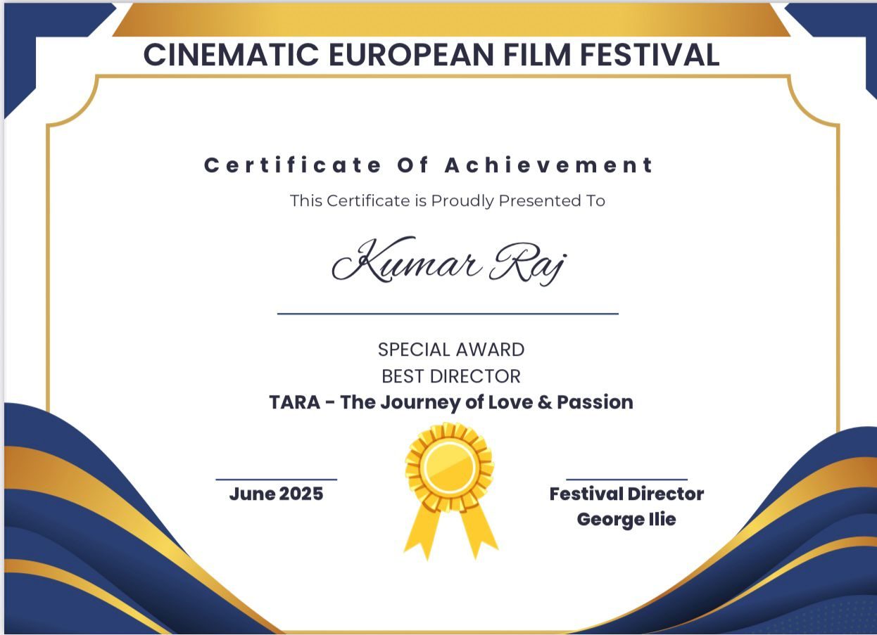 Bania, Romania | July 11, 2025 — Acclaimed Indian filmmaker Kumar Raj has been awarded Best Director at the prestigious Cinematic European Film Festival 2025, hosted in the culturally rich town of Bania, Southern Transylvania. The award was presented for his critically celebrated films Ameena and Tara, which were praised for their humanistic storytelling, emotional depth, and universal appeal.