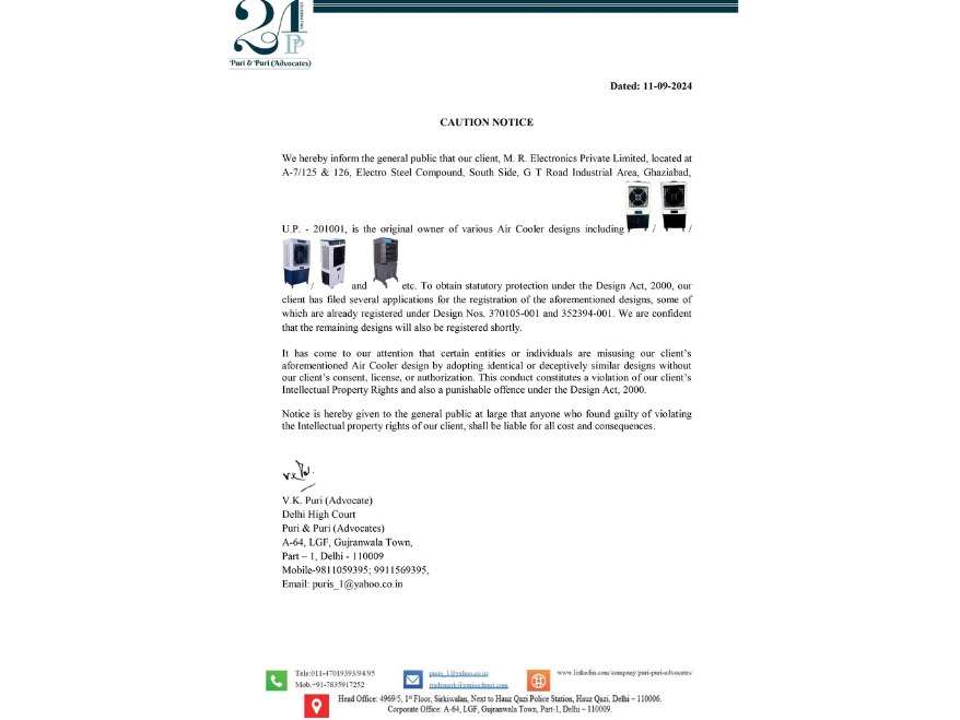 It has come to the company’s attention that certain entities and individuals have been misusing M. R. Electronics’ air cooler design. These parties have allegedly adopted identical or deceptively similar designs without obtaining proper consent, license, or authorisation from M. R. Electronics Private Limited.