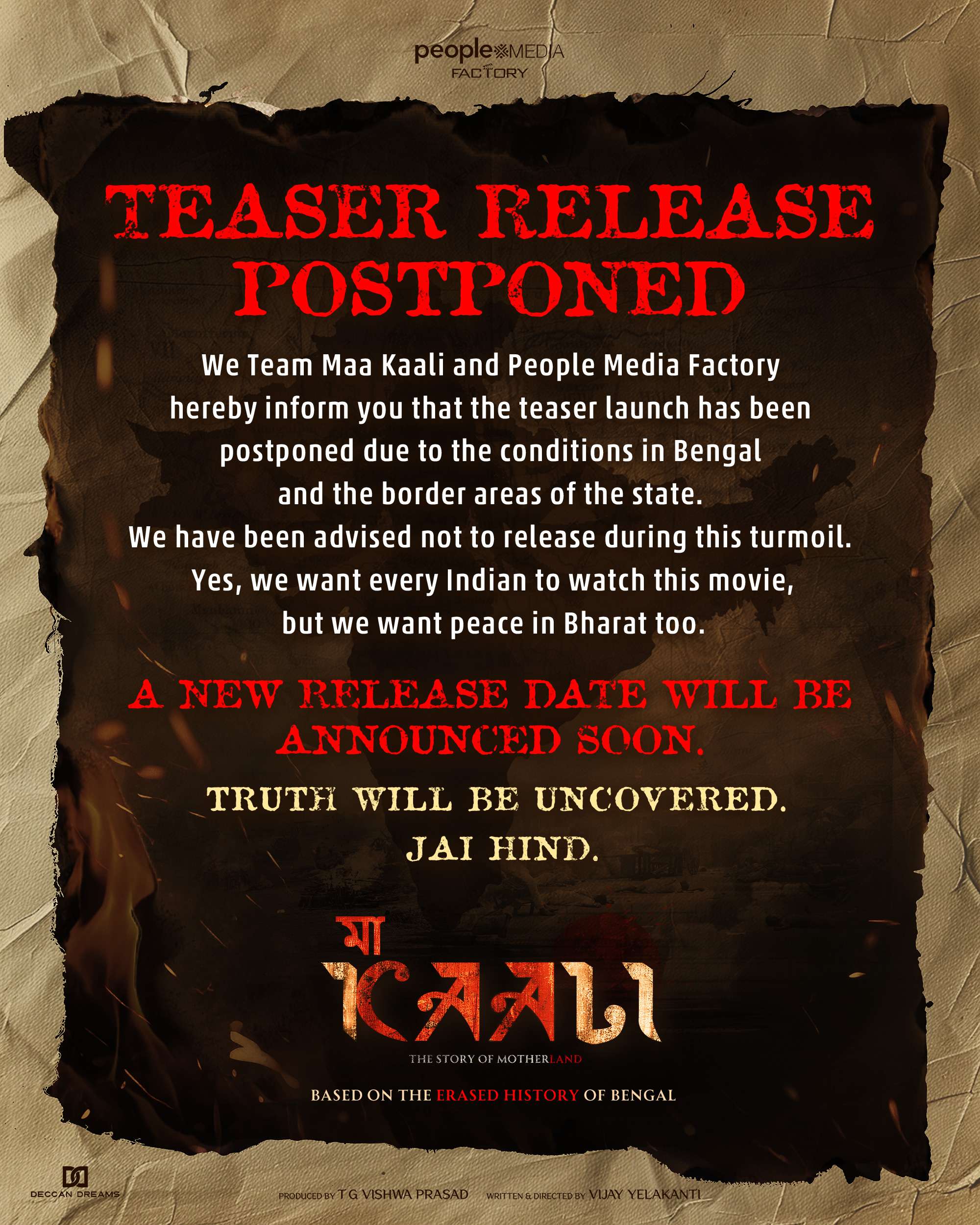 The new release date will be announced soon, with aggressive promotions planned to ensure it reaches everyone in India. “Maa Kaali” aims to reflect the essence of Bengali identity and awaken Bengali consciousness. The team is proud of their work and delighted by the praise received from notable figures. They hope the film will reach a wide audience across India in a tranquil setting.