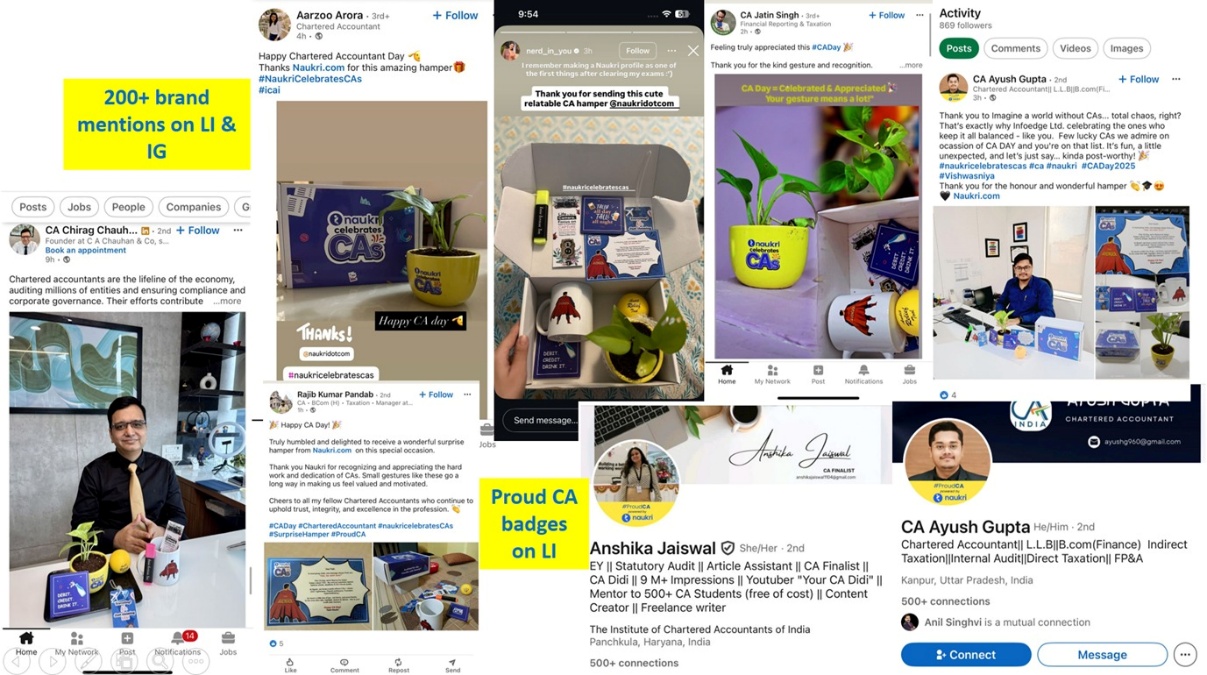 Adding a personal touch, Naukri sent curated hampers to over 200 registered CAs. Each box included an indoor plant, custom coffee mug, quirky stress ball, themed coasters, a luggage tag, highlighter, and a personalized CA Day note. Recipients shared pictures across their networks, proudly flaunting the custom LinkedIn badge #ProudCA, which quickly gained traction.
