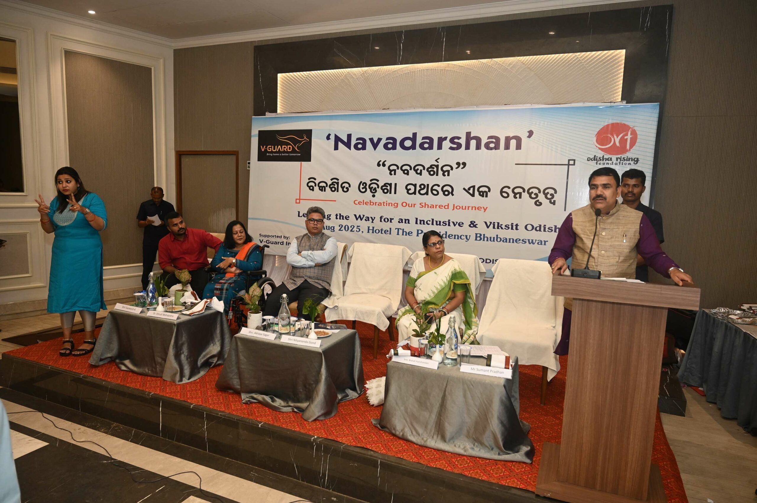 Photo Caption: Saneesh K., Chief CSR Officer, V-Guard Industries Ltd.; Dr. Shruti Mohapatra, Secretary, Swabhiman; Akhaya Sagar, Chairman & Co-Founder, Odisha Rising Foundation; Bratati Harichandan, IAS (Retd.), State Commissioner for Persons with Disabilities; and Nityananda Gond, Hon’ble Minister for School & Mass Education; ST & SC Development; Minorities & Backward Classes Welfare (From left) during the Navadarshan Reflection Ceremony 2025 held in Bhubaneswar.
