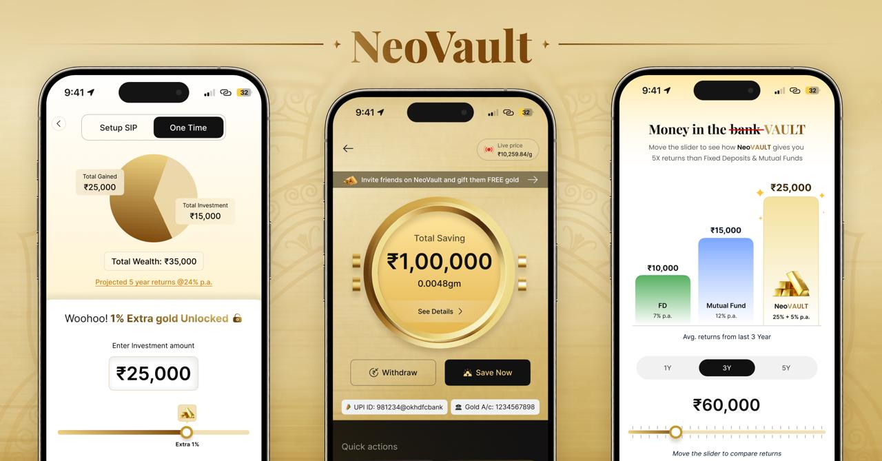 NeoVault allows users to invest, save, and grow their gold digitally while maintaining the flexibility of instant withdrawals. The account is powered by HDFC Bank and provides users with a personalised account number and UPI ID, enabling them to save money directly into gold through seamless digital transactions.