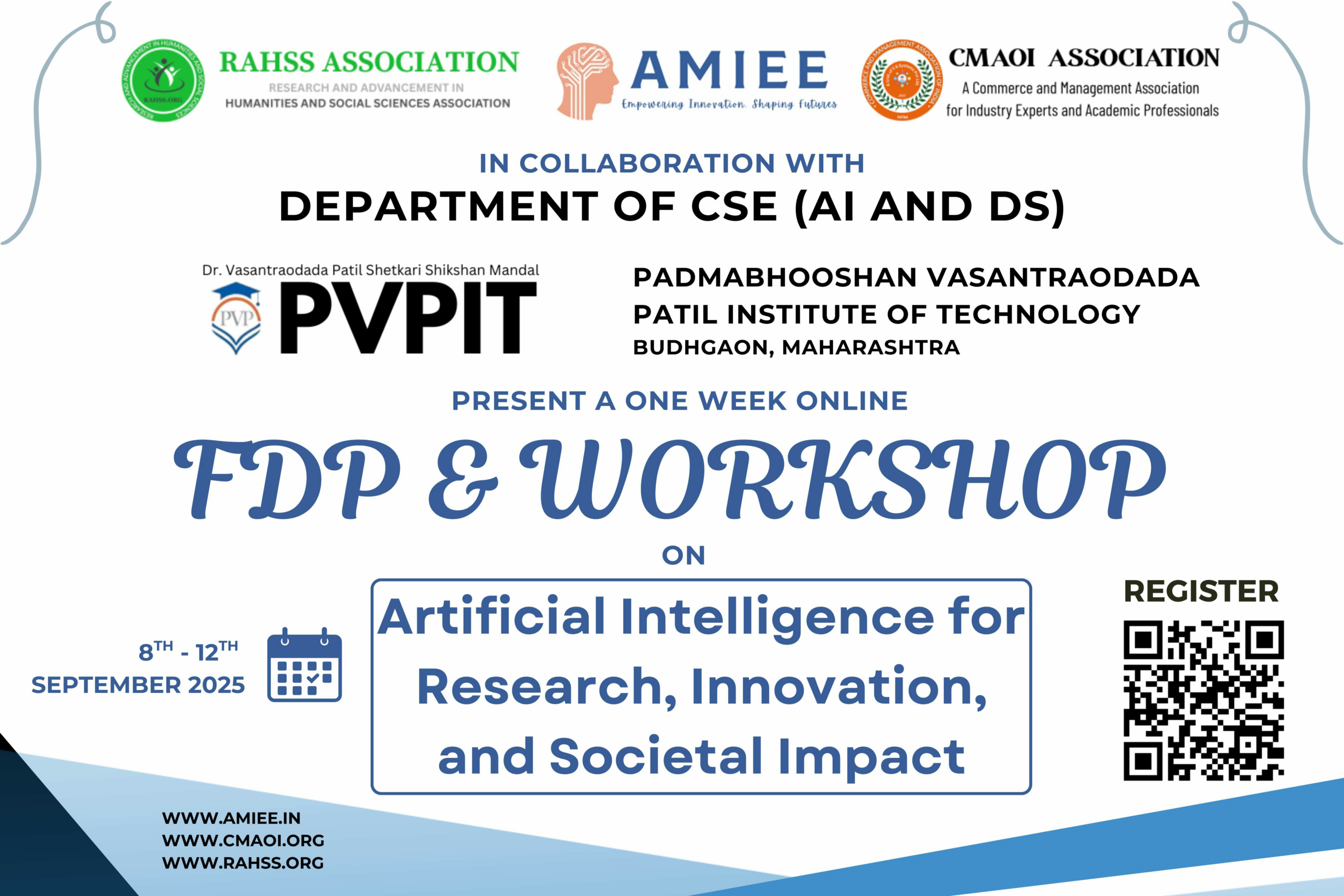 The RAHSS Association, in collaboration with AMIEE Association, CMAOI Association, and the Department of CSE (AI & DS), Padmabhooshan Vasantraodada Patil Institute of Technology (PVPIT), Budhgaon, Maharashtra, has announced a One Week Online Faculty Development Program (FDP) and Workshop on “Artificial Intelligence for Research, Innovation, and Societal Impact”. Scheduled from 8th – 12th September 2025, the event aims to equip participants with advanced knowledge of Artificial Intelligence (AI) and its role in shaping innovation, solving real-world challenges, and encouraging interdisciplinary research.