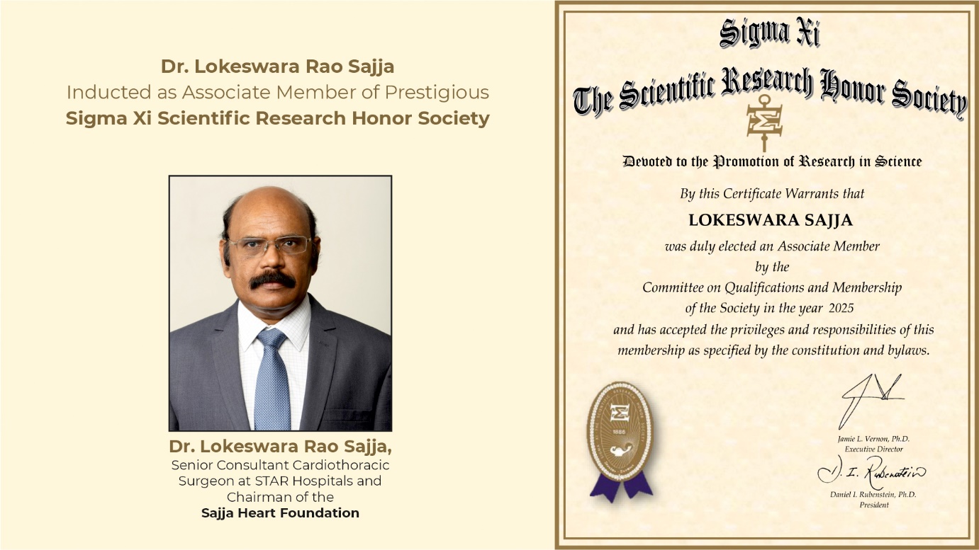 Dr. Lokeswara Rao Sajja, Senior Consultant Cardiothoracic Surgeon at STAR Hospitals and Chairman of the Sajja Heart Foundation, has been inducted as an Associate Member of Sigma Xi, The Scientific Research Honor Society—one of the world’s oldest and most respected organizations dedicated to the advancement of science and research.