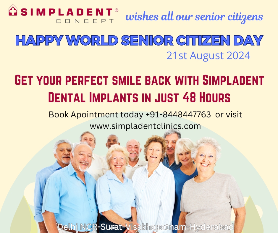 Delhi NCR-Hyderabad-Surat-Visakhapatnam, India – August 21, 2024 – On the occasion of World Senior Citizen Day, Simpladent Dental Implants extends warm wishes to all our senior citizens. This special day is dedicated to honoring and recognizing the invaluable contributions of our elderly population to society. At Simpladent, we are not only committed to celebrating our seniors but also to empowering them with the confidence and quality of life that comes with a healthy smile.