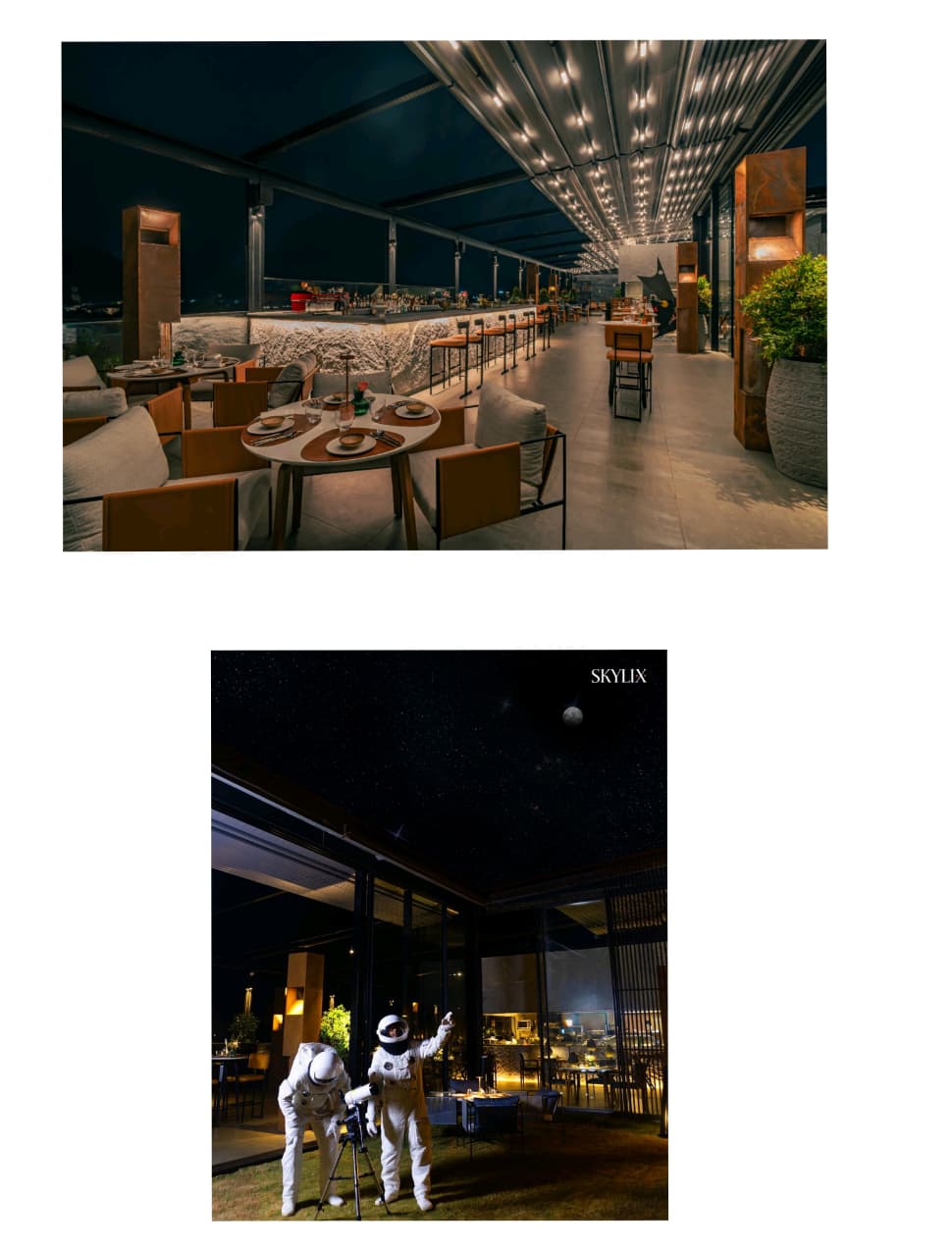 The heart of Skylix comes alive on the iconic Observatory Deck. Under a canopy of stars glowing with warm amber torchlight and gentle moonlight guests find themselves immersed in an atmosphere that feels dreamlike yet inviting. Adding to the venue’s charm is the signature theatrical descent of astronauts, a moment of whimsy that has become symbolic of Skylix’s spirit. Guests can begin the evening with the Sunset Toast Ritual at the Vantage Point, drift through golden hour aboard the playful Champagne Boat on Wheels, or unwind with a serene stargazing experience under the open sky.