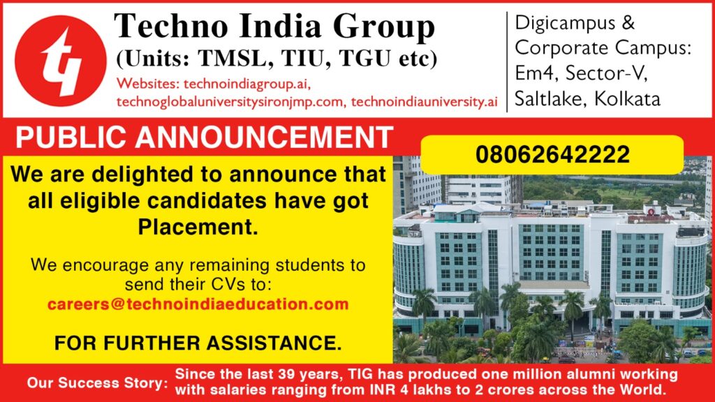 Kolkata, India – July 7, 2024 – Techno India Group (TIG), a premier educational institution known for its excellence in fostering talent, is proud to announce that all eligible candidates from their recent graduating batch have secured placements. This achievement is a testament to TIG’s unwavering commitment to providing top-notch education and career opportunities to its students.