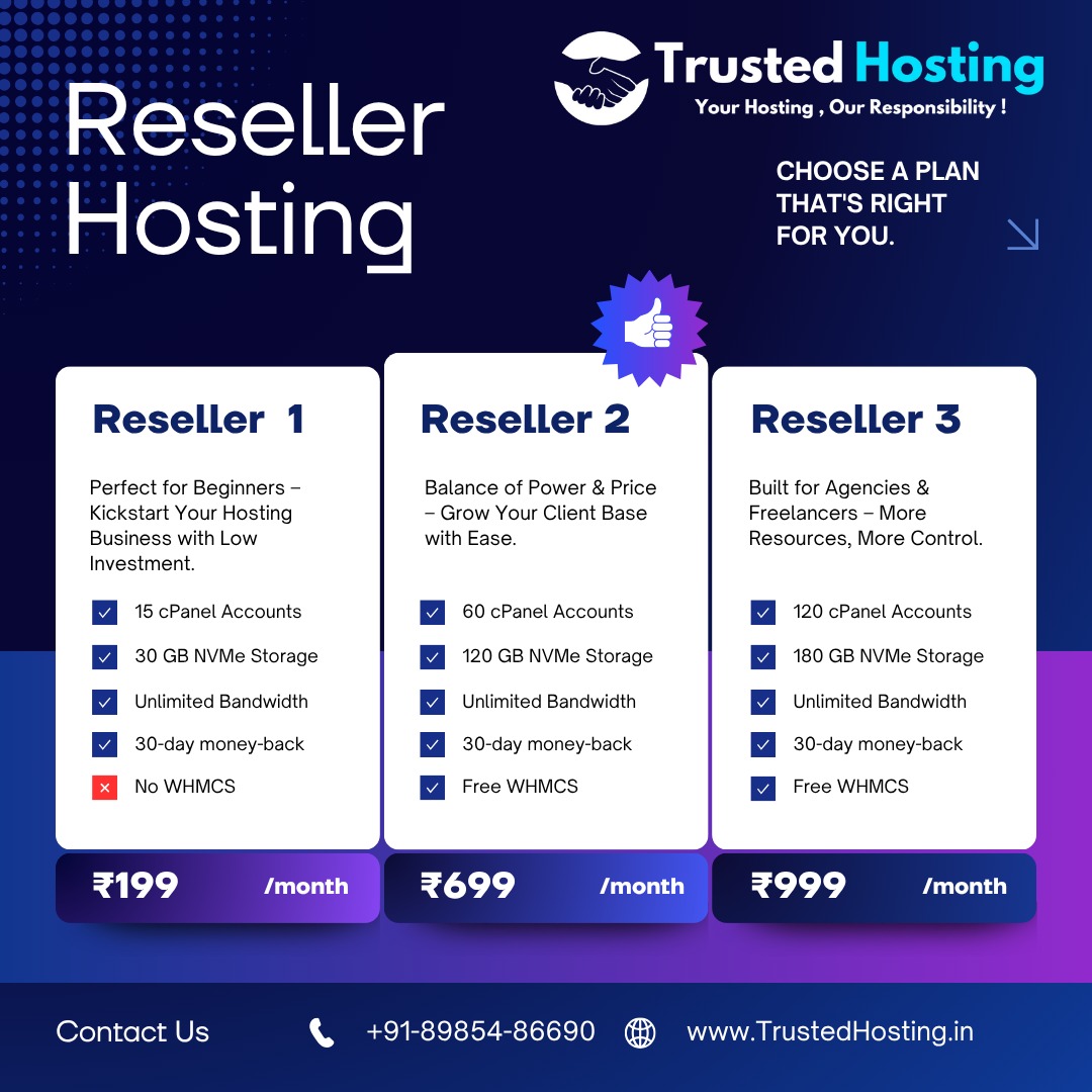Catering to freelancers, developers, digital agencies, and IT startups, TrustedHosting.in has empowered over 10,000+ resellers across India and abroad to start their own hosting businesses — with plans starting at just ₹199/month.
