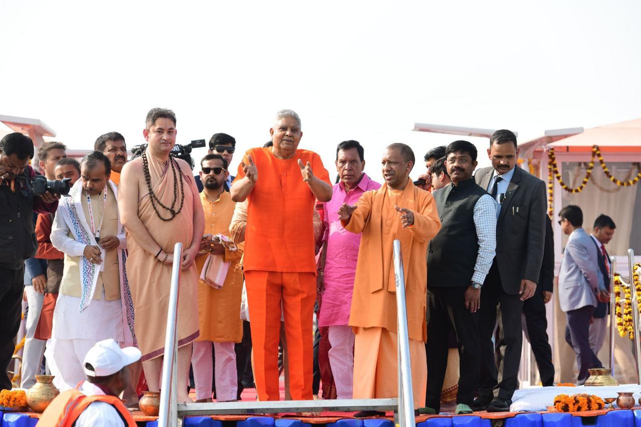 Prayagraj, Uttar Pradesh: In a moment of deep spiritual significance, the Vice President of India, Shri Jagdeep Dhankhar, along with his wife Shri Sudesh Dhankhar, took a sacred dip at the Prayagraj Sangam during Maha Kumbh 2025 under the divine guidance of Manmadhav Gaudeshwar Vaishnavacharya Shri Pundrik Goswami Ji Maharaj. The holy occasion, which symbolizes purification and spiritual awakening, was further graced by the presence of Uttar Pradesh Chief Minister, Shri Yogi Adityanath, making it a remarkable confluence of spirituality and governance.